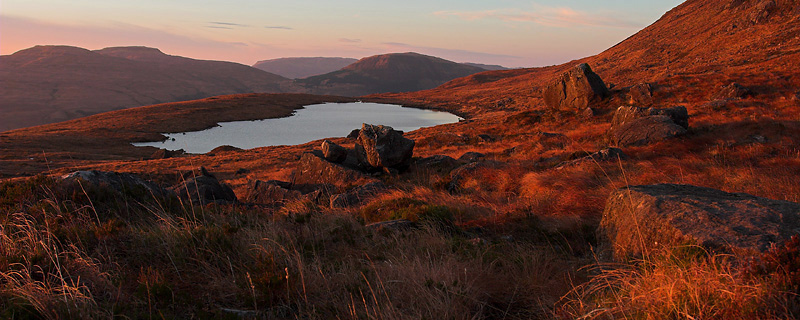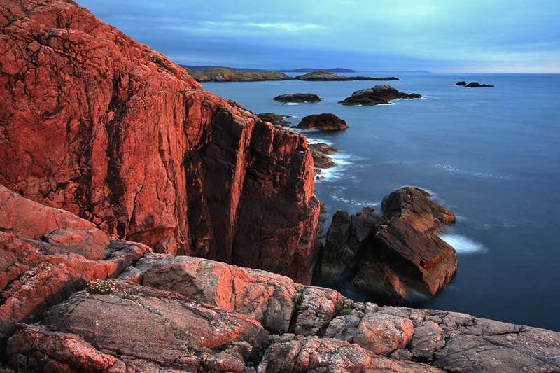 Sunset light on the far north west coast of Scotland; a wilderness of windswept rock, clinging lichen and wild seas. This shot taken