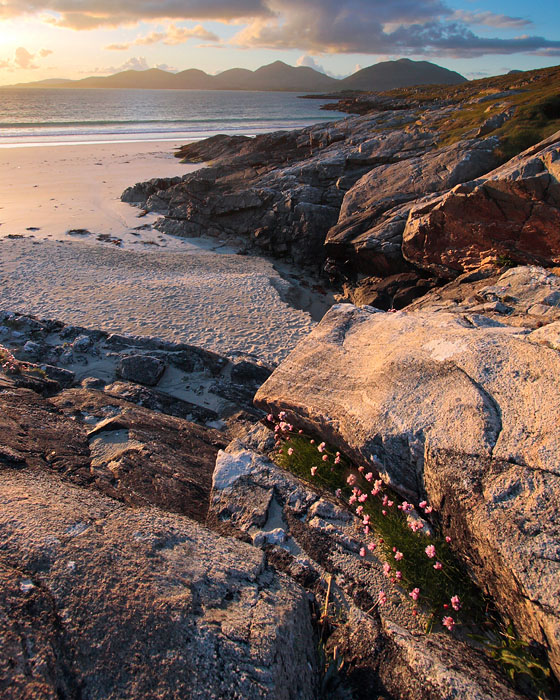 Spring flowers basking in the orange glow of a Hebridean sunset.