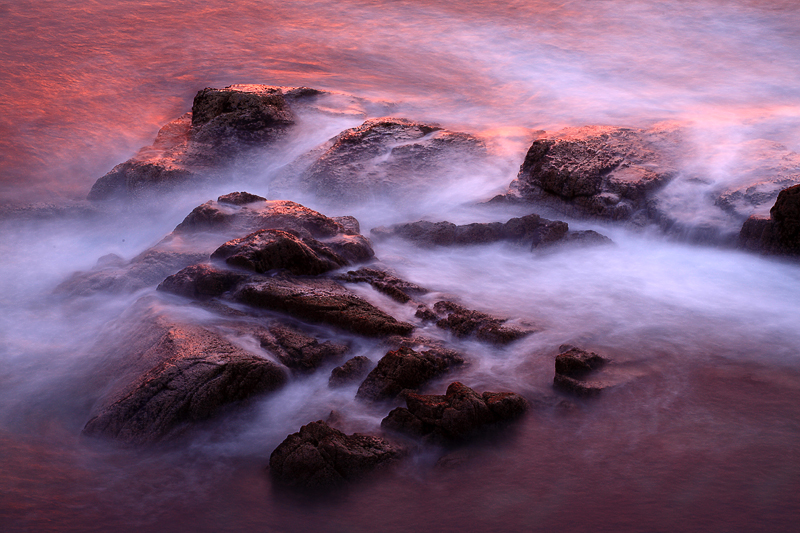 magenta light reflecting on the waves into a painting-like blend of sunset hues across the sea and wet rocks.