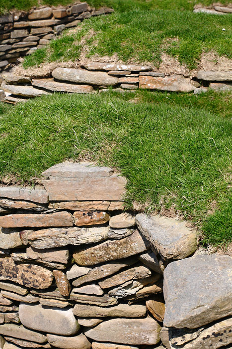 Neolithic settlement of Skara Brae lies half buried in grass and sand on the edge of an encroaching beach.