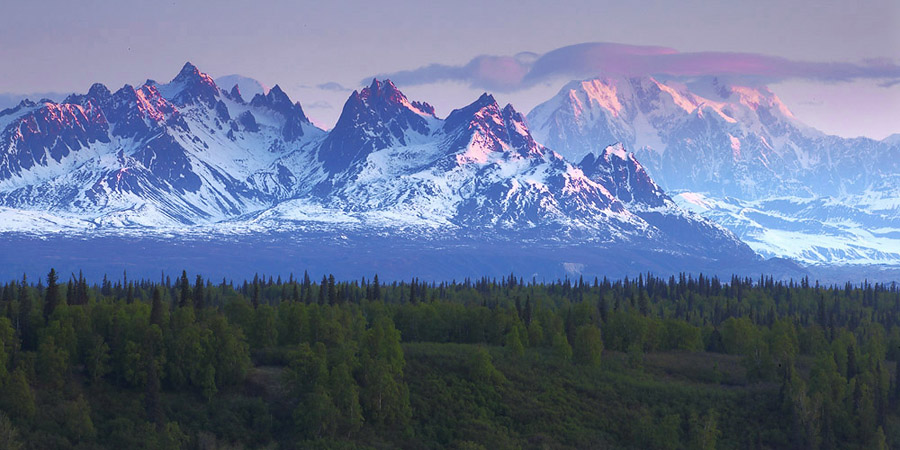 Denali National Park, Alaska, USA. Alpenglow on Mt Hunter and the Alaska Range.