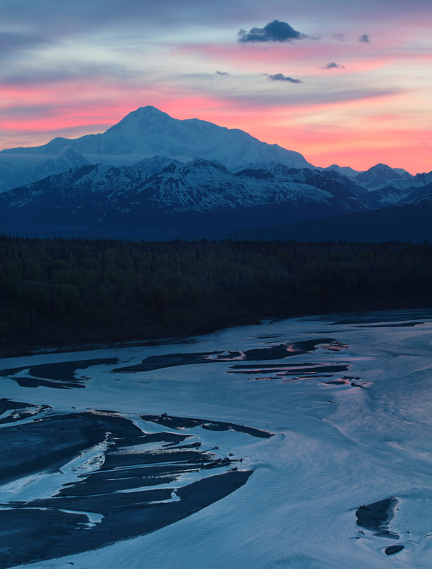 Chulitna River, Alaska, USA. The sunset colours were beginning to fade and slip further behind Denali as two small clouds drifted into the frame to echo the sand bar islands in the river below.