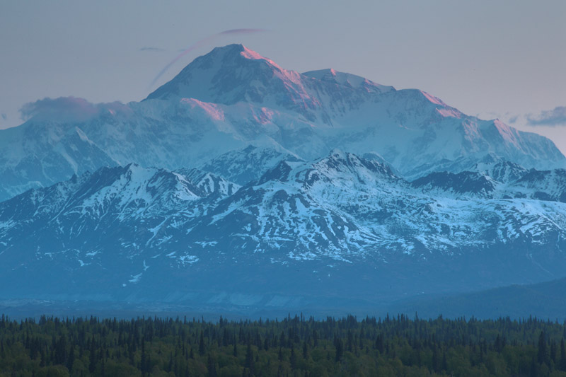 Alaska, USA. It's unusual for Denali to even be visible: such is its size that it creates its own weather patterns and is rarely free of cloud. So to catch this still clear morning with Denali's summit surrounded by a thin cloud halo was extremely lucky.
