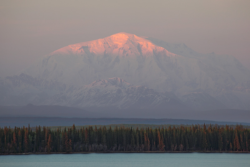 Mount Blackburn, Wrangell-St. Elias National Park, Alaska, USA. After the sun had set, camped by the side of the road above Willow Lake, the early summer mosquitos were rampant. But when I saw a pink alpenglow lighting up the tip of Mt Blackburn, an ancient volcano and the highest peak in the Wrangell Mountains hundreds of miles away, I wasn't about to let a mosquito or fifty get in the way of my shot...
