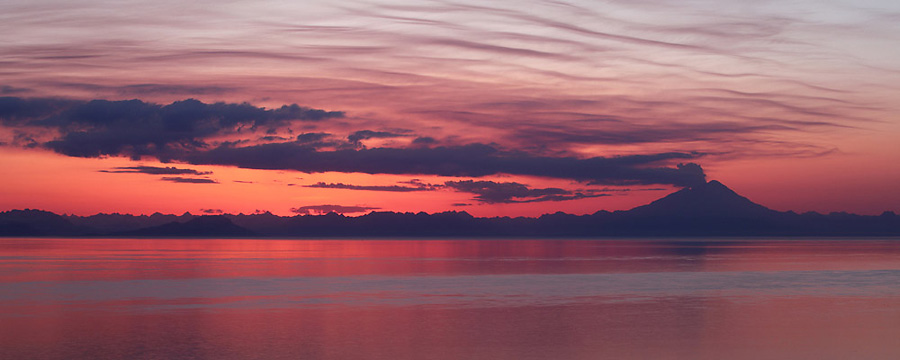 Cook Inlet, Kenai Peninsula, Alaska, USA. The state-owned Stariski campground lies just off the Sterling Highway, which runs down the eastern shore of the Cook Inlet. Perched atop the cliffs, both the highway and the campground have incredible views looking over the inlet to the volcanoes on the far shore. On our visit however, the view was even more spectacular than usual: Mt. Redoubt, the third highest peak of the Aleutian Range and an active stratovolano, was erupting. Devoid of its usual snow cover compared to its neighbours, the plume of steam from the summit lava dome is here strewn across the sky by prevailing winds. We were the sole users of Stariski for this night; the entire campsite was covered in a thick layer of volcanic ash.