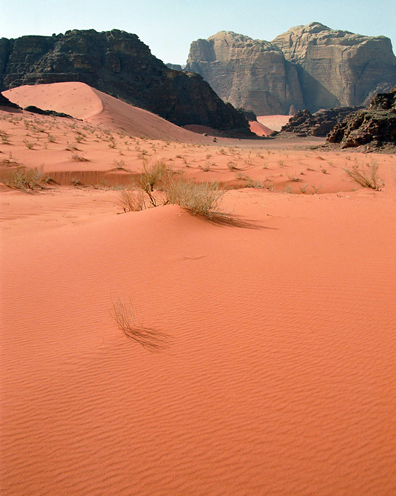 Wadi Rum desert, Jordan. This desert of red sands and melting chocolate rock is punctuated by huge monoliths of towering sandstone.