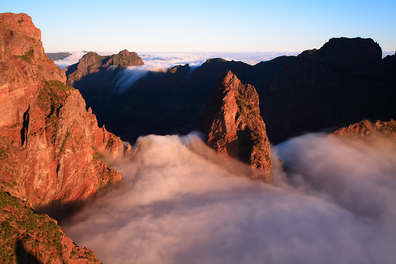 Pico du Aireiro, Madeira. Clouds surround the high peaks of Madeira at dawn and begin to spill into the interior valleys. I used a slow shutter speed of a few seconds to capture an impression of the clouds' movement over the cusp of the ridge.