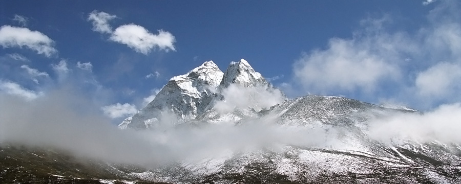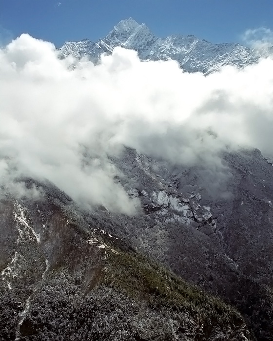 Namche, Khumbu Valley, Nepal. An incredible morning; it was a snowy, foggy drudge along a path above and behind the town of Namche, heading along the side of a deep valley. Initially due to the fog we could barely see the person in front. Then, suddenly and magically, the dense grey cloud lifted, and to our right this view of the entire valley far below rising up to the sharp mountain peak above became visible.