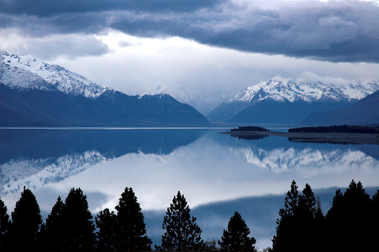 Lake Pukaki, Canterbury. This view of a calm and glassy Lake Pukaki opened up as I drove along the road from Tekapo village on a cool cloudy evening. In the week I spent in the area I never saw the lake even half as still as this.
