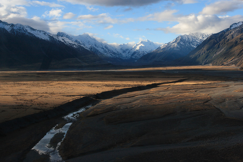 Mount Cook National Park, New Zealand. This opportunity presented itself as we descended to land at Mount Cook Airport in a skiplane. The lengthening evening shadows and sky-reflecting river winding away towards Tasman Glacier give this image a dramatic atmosphere.