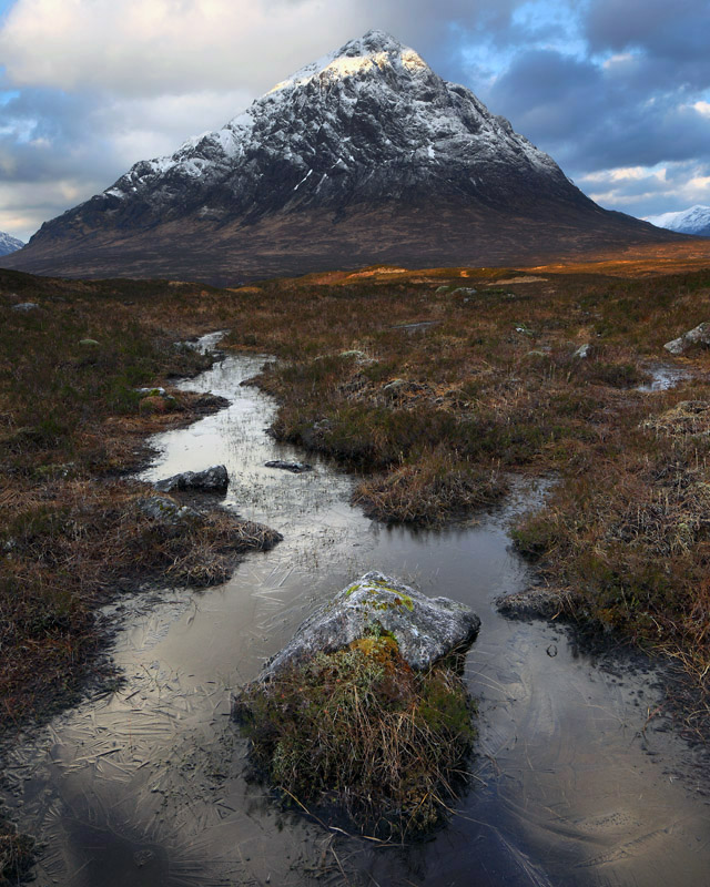 Rannoch Moor, Scotland. My feet were getting chilly in my wellies standing in a frozen river at -7 degrees C. Sunrise was just catching the top of Buachaille mountain.